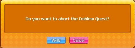 「Do you want to abort the Emblem Quest?(あなたはエンブレムクエストを中止したいのですか?)」と聞かれますので、「Verify(そうします)」という方をクリックすると止めることが出来ます。やはり止めたくないと思ったら隣の「Cancel(キャンセル)」を押してください。