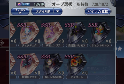 オーブ選択画面の右上にある「アイテム変換」ボタンを押すことで