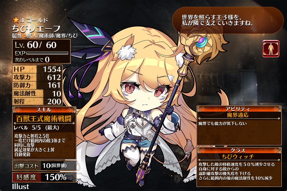 ちびリエーフ | ちびウィッチ (ウィッチ) | Lv1 | 1107 | 314 | 60 | 10 | 200 | 13 | 10 | 攻撃力+144 防御力+72 攻撃硬直-10% | 百獣王式魔術戦闘 | 魔界適応 |