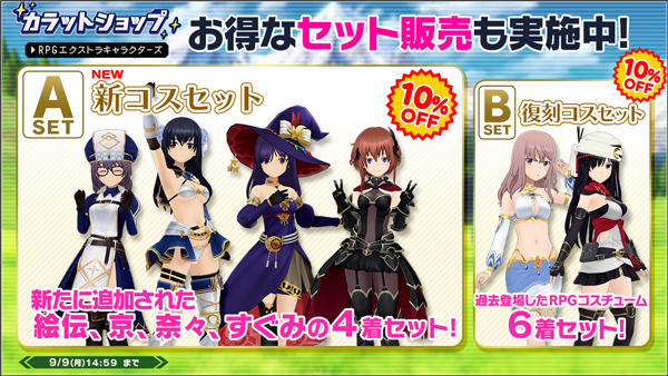 - 新規キャラと既存キャラの衣装がそれぞれ1割引で一括購入できるセット商品がある。