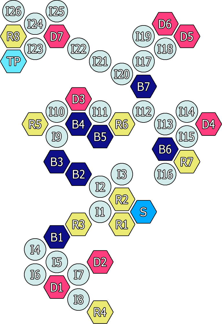 - (R1/R2)→B2→B3→(B4/D3)→R6→B7→D7→TP