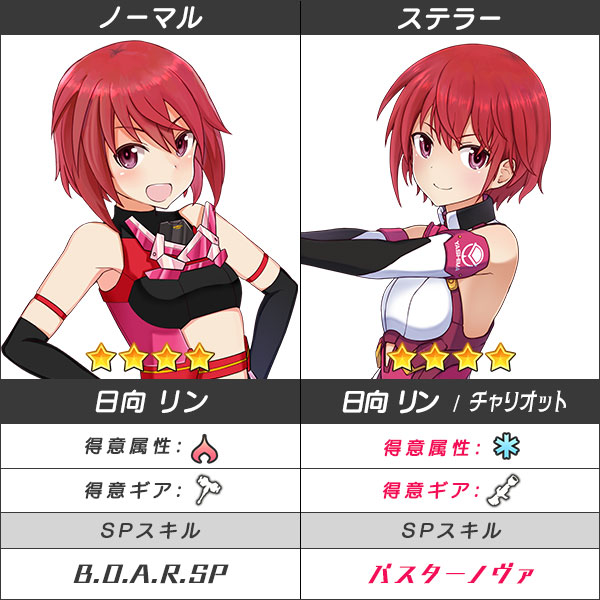 さらに、パッシブスキル<バズーカGマスター>を獲得したことでショットギアの攻撃力が上昇し、射撃戦を得意とする構成となった。ノーマルの「日向 リン」から属性タイプが<冷撃特質放出>に変更されたことで、焼夷属性に対して「与えるダメージは大きいが、受けるダメージも大きい」構成に変化。