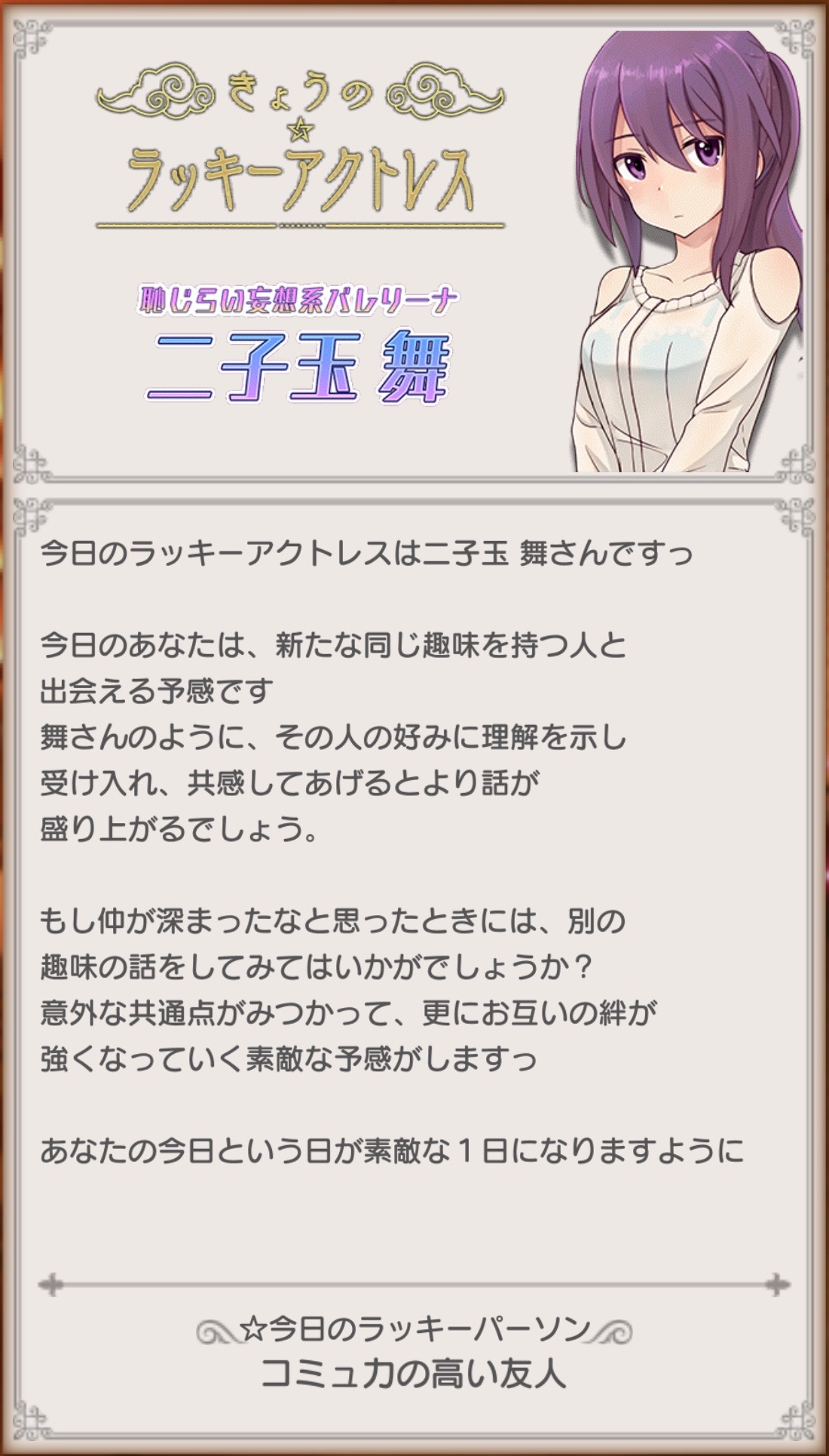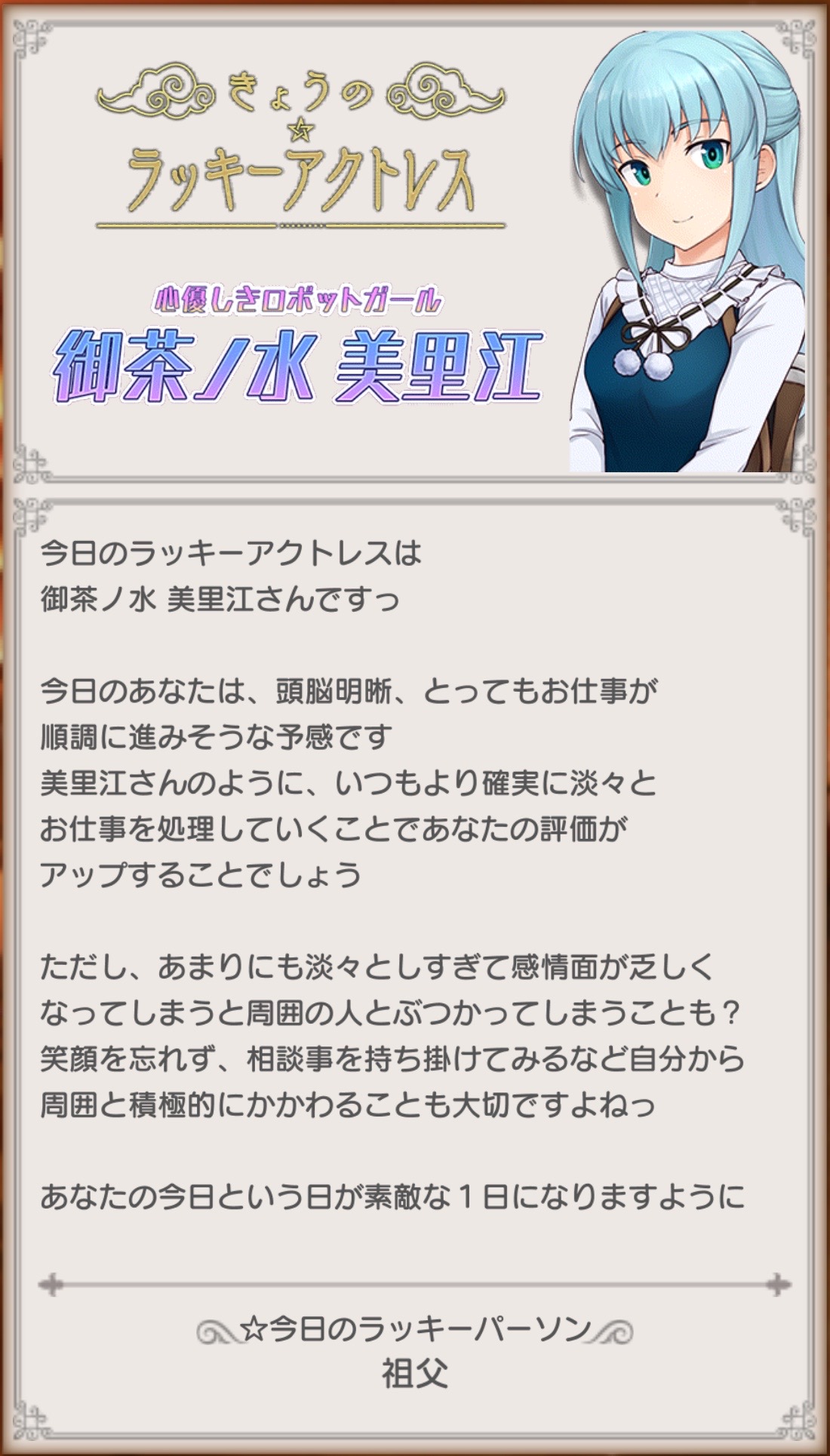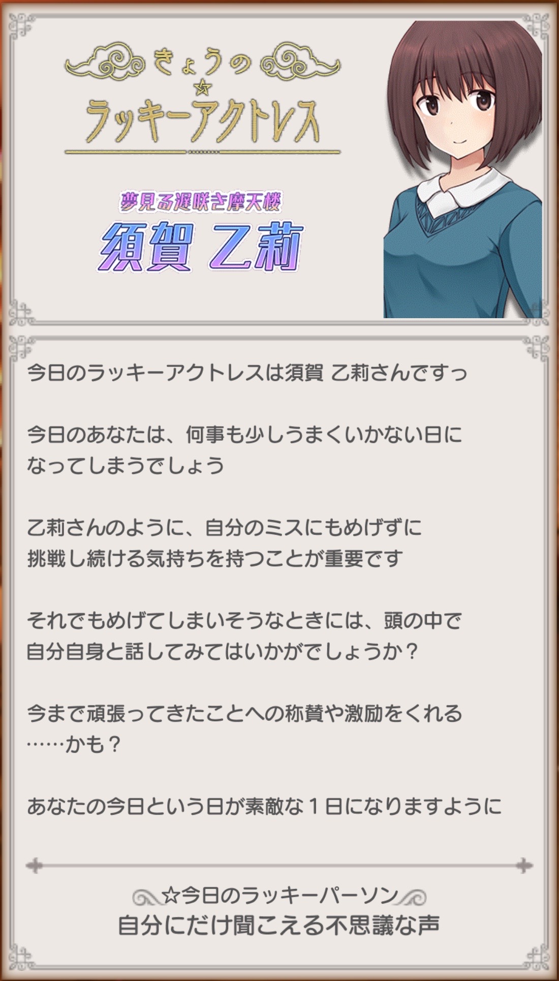 | - | きょうのラッキーアクトレス | ミニゲーム | |||||