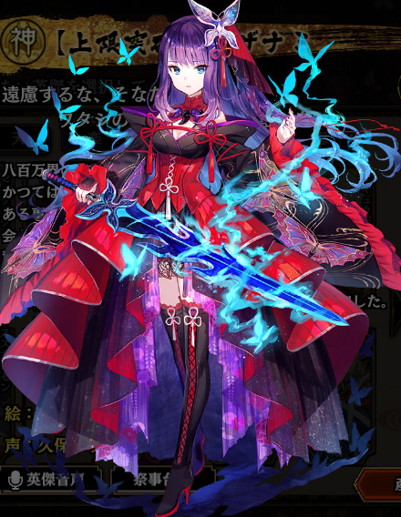 | 英傑誕生時 | ワタシの名はイザナミ。 黄泉の主宰神(しゅさいしん)と言われておるが……実力は、その目で確かめるとよい。 |