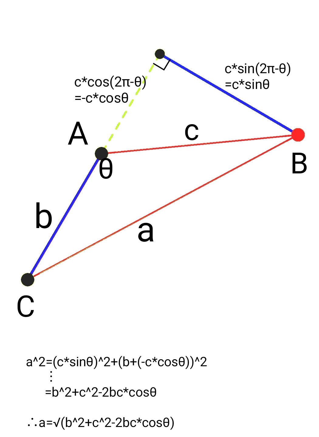 law of cosinesらしい。コサイン法則とか呼んでくれたら少なくともコサイン使うのは絶対忘れないのにね。余弦って言われても分からなくない?