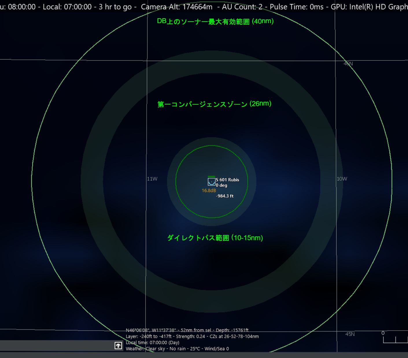 ただし,一度海底に向かった音波は深海等温層に到達すると折れ曲って再度海面に向かい,海面で反射すると再び海底方向に向かい,等温層でまた折れ曲がり…を繰り返していく.このとき正弦曲線を描くようにして一定の距離ごとに音波が海面で収束する箇所が存在する.これがコンバージェンスゾーン(収束帯,CZ)と呼ばれるもので,潜水艦から一定の距離ごと,例えば距離30nm,60nm,90nm…に範囲約5nmのリングを描くようにして発生する.ただしCZはローカル深度・緯度に応じて利用できる海域に制限があるので,一定条件下においてダイレクトパス範囲を超えて特別にソーナー探知が行える「ボーナス範囲」と考えるべきである.それぞれのCZ間はシャドーゾーンであり,やはり音波はソーナーへと伝わらず探知は不可能である.リュビ搭載のソーナーは最大40nmの探知範囲をもつので,26nm(範囲加味すると23-30nm)にある第一CZのみを利用することができる.