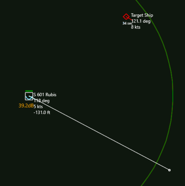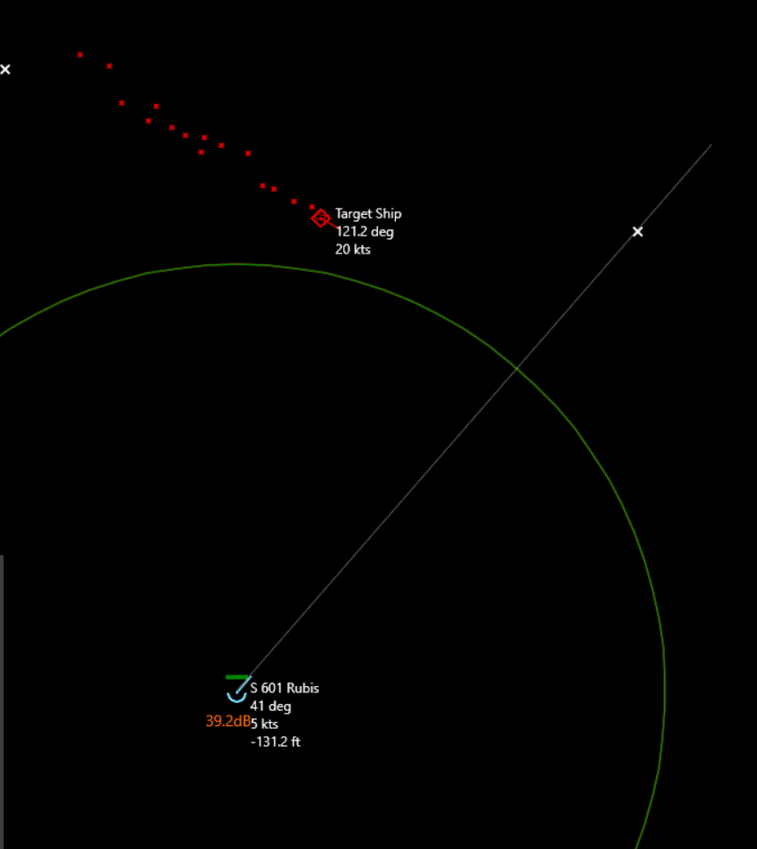 - リュビの速力が0kts,深度-984ft/300mに設定されているが,これを速力10kts以下,深度を-40m/-131ftに変更する.これ以深の深度だとタンカーを探知しない可能性あり