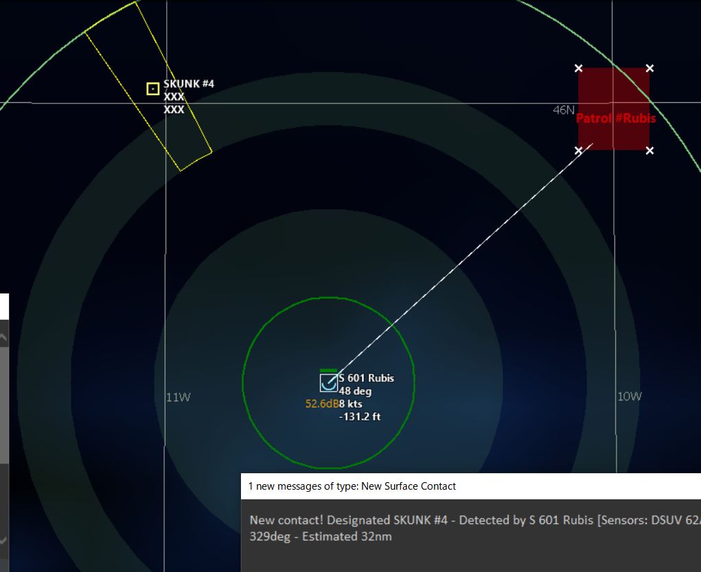 ほぼ正確に目標の位置を提供するレーダー探知とは異なり,最初のソーナー探知ではコンタクトアイコンの周りにかなり大きい不確実領域(AOU,四角い線)が存在している.一回の探知だけでは「この方位,大体この辺の距離に目標がいる」程度の情報しかわからない.より詳細な目標の情報(目標の艦種は?より具体的な位置=方位と距離は?針路は?速力は?(潜水艦の場合)深度は?)を得るためにはソーナー探知を何度か続ける必要がある.
