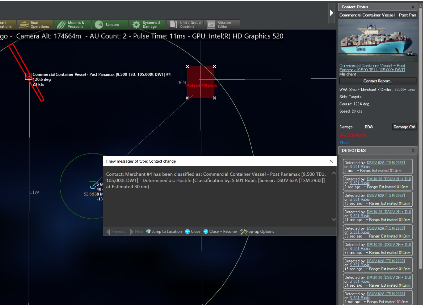 時間を進めてソーナー探知を何度か得ると,目標の艦種,針路,速力(10万トンコンテナ船,南東,23kts)が判明する.しかしAOUは小さくならず大きいまま.これもCZ探知におけるAOUの特徴.