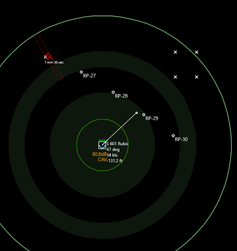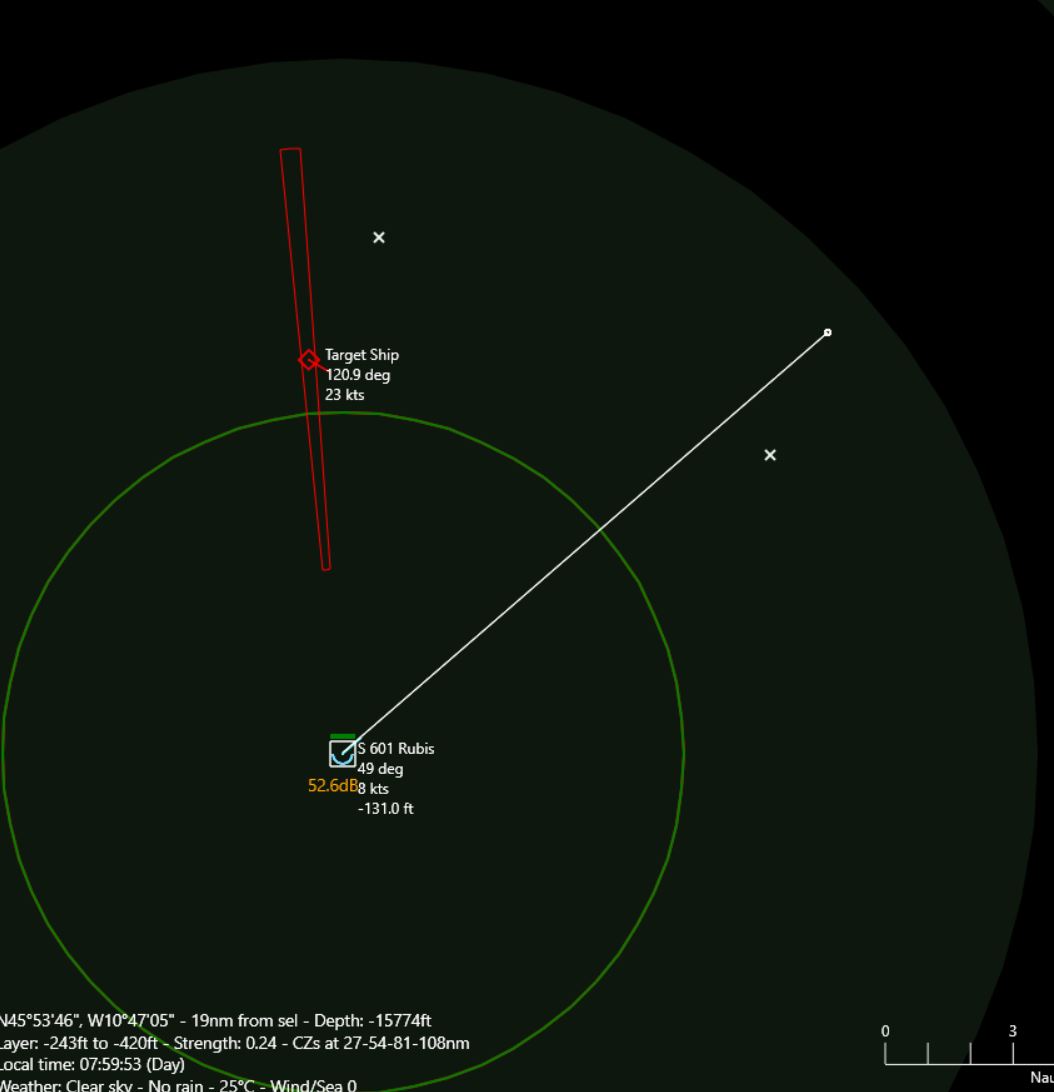 - 最初の探知は目標艦が第一CZ,すなわち距離23-30nmに入ったときに行われる.リュビ搭載のソーナーは最大40nmの探知範囲をもつにもかかわらず,CZの範囲外である30-40nmでは音がソーナーへと伝わらないため目標艦を探知できない(いかに騒音が大きくても!).