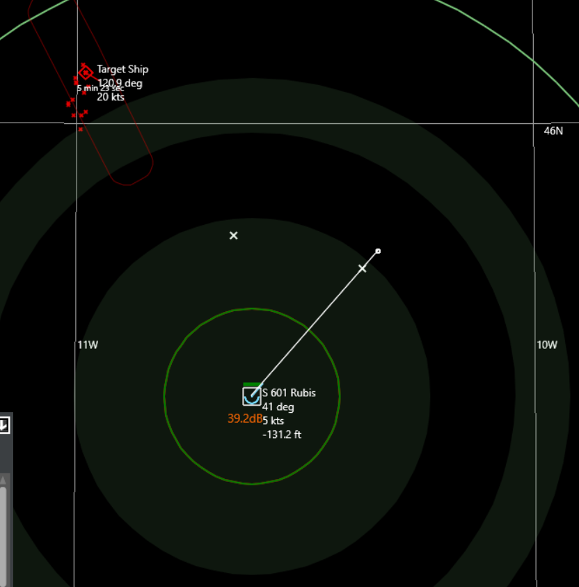 連絡先は、23ktの速度で120コースです。 この接触の単純な切片をプロットするには、範囲と方位ツール(ctrl + D)を使用して、不確かさの領域の最も近い点から23nm(接触の速度)離れた参照点を配置します。 120度の方位(私たちの連絡先)。 これは、1時間以内に連絡がとれる場所です。Rubisから約12nm離れている必要があります。 先ほど特定した位置にコースをプロットし、速度を「クルーズ」に設定します。 ルビスの巡航速度は12ktであるため、船の直前にその位置に到着します。