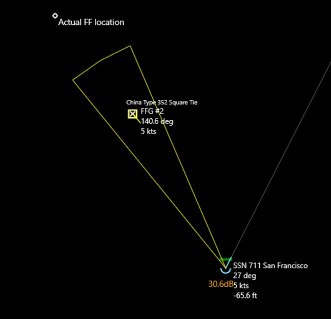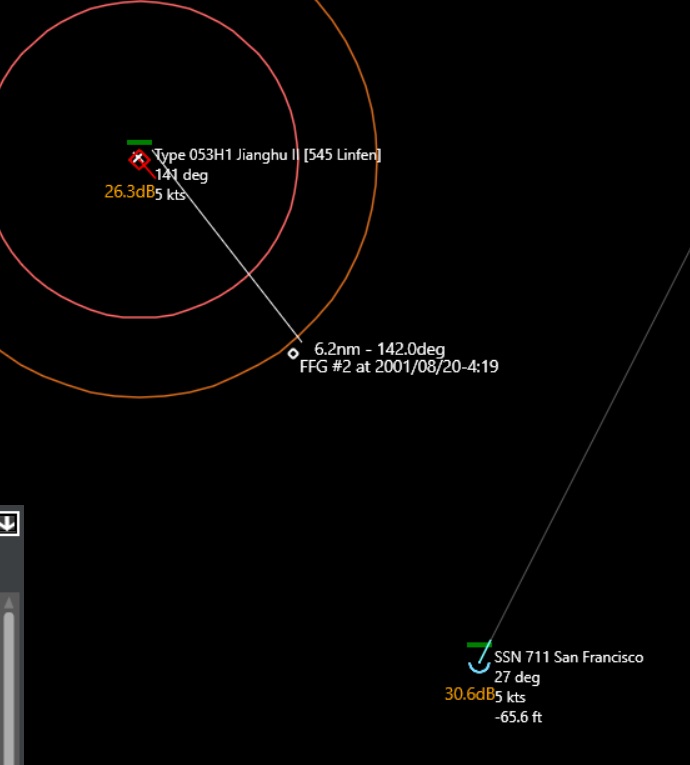 これで、接触をJianghu(江滬)級フリゲートとして明確に特定しました。指示に従っていれば、AN/TB-16D 牽引式アレイソナーによって特定されています。 他の可能性としては、AN/BQQ-5Eハルソナー、AN/TB-23牽引式アレイ、または潜望鏡の深さで視覚範囲内に到達できた場合には由緒あるMk1 Eyeball(訳注:肉眼のこと)が含まれます(これらのセンサーの概要については、サンフランシスコのデータベースエントリを確認してください)。