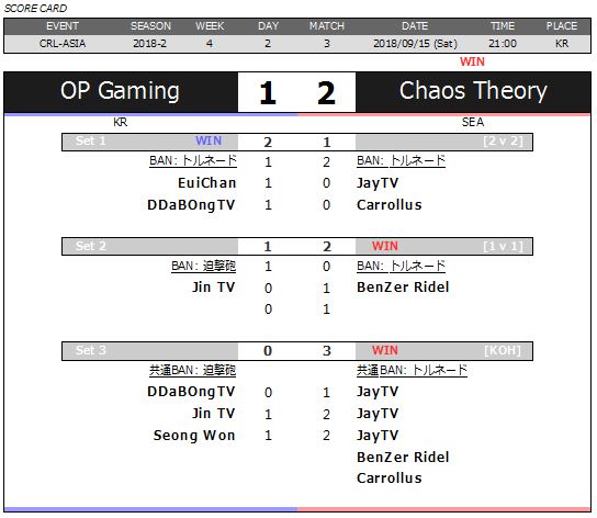 「CRL Asia」 Season 2 Week 4 の試合詳細/score cards