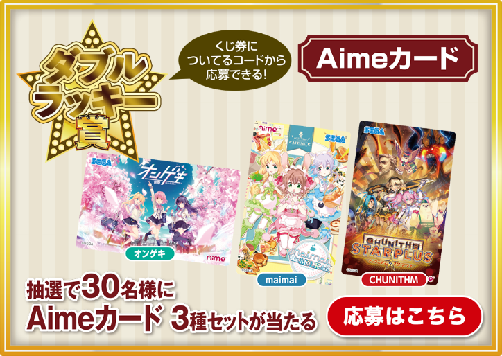 - ダブルラッキー賞として、D賞3種セットが抽選で30名に当たる。くじ券1枚で1口応募可能。詳しくはセガプラザサイトへ。(webアーカイブ)