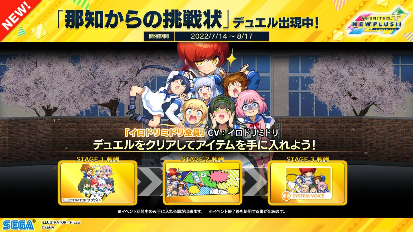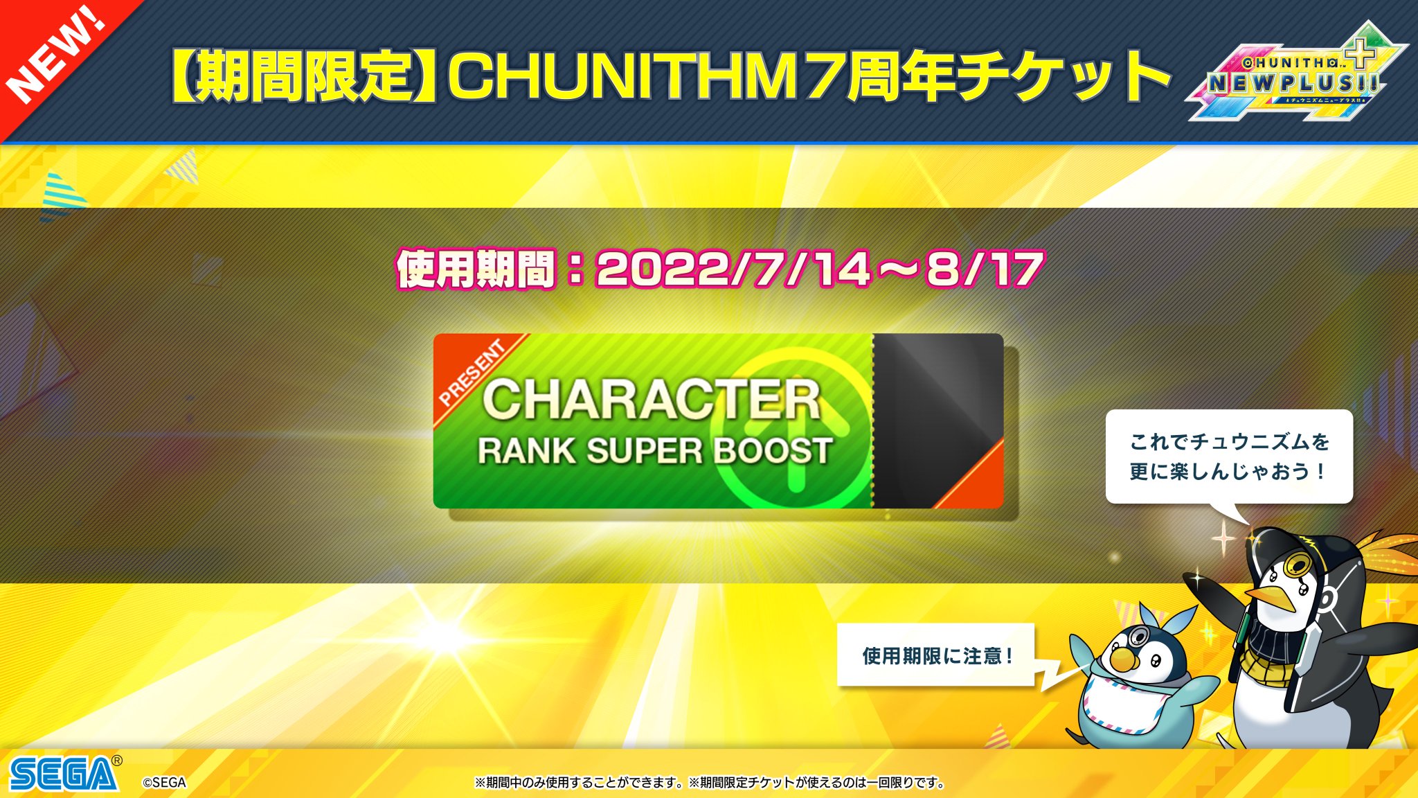 2022/7/14(木)~2022/8/17(水)期間中、『【期間限定】CHUNITHM7周年チケット』を1枚配布。