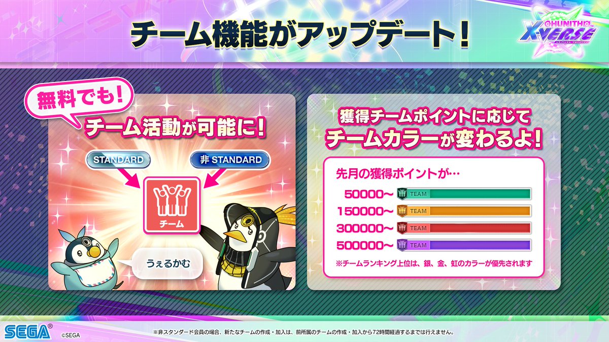 VERSEまではチームランキングの順位に応じて「銀」「金」「虹」の3色が付与されていたが、ランキングによる色の対象外であるチームは先月のチームポイント獲得量に応じて新たなカラーが付与されるようになる。- バージョンアップ時点では適用なし。8月より適用。*10