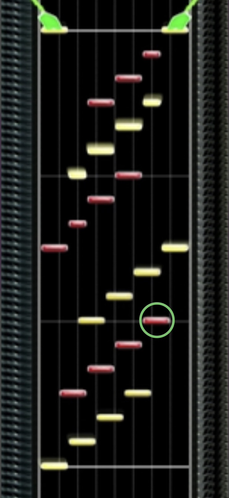 分割トリルは緑丸で囲んだノーツが巻き込みやすいため注意。直後の階段はノーツの左側を狙う。