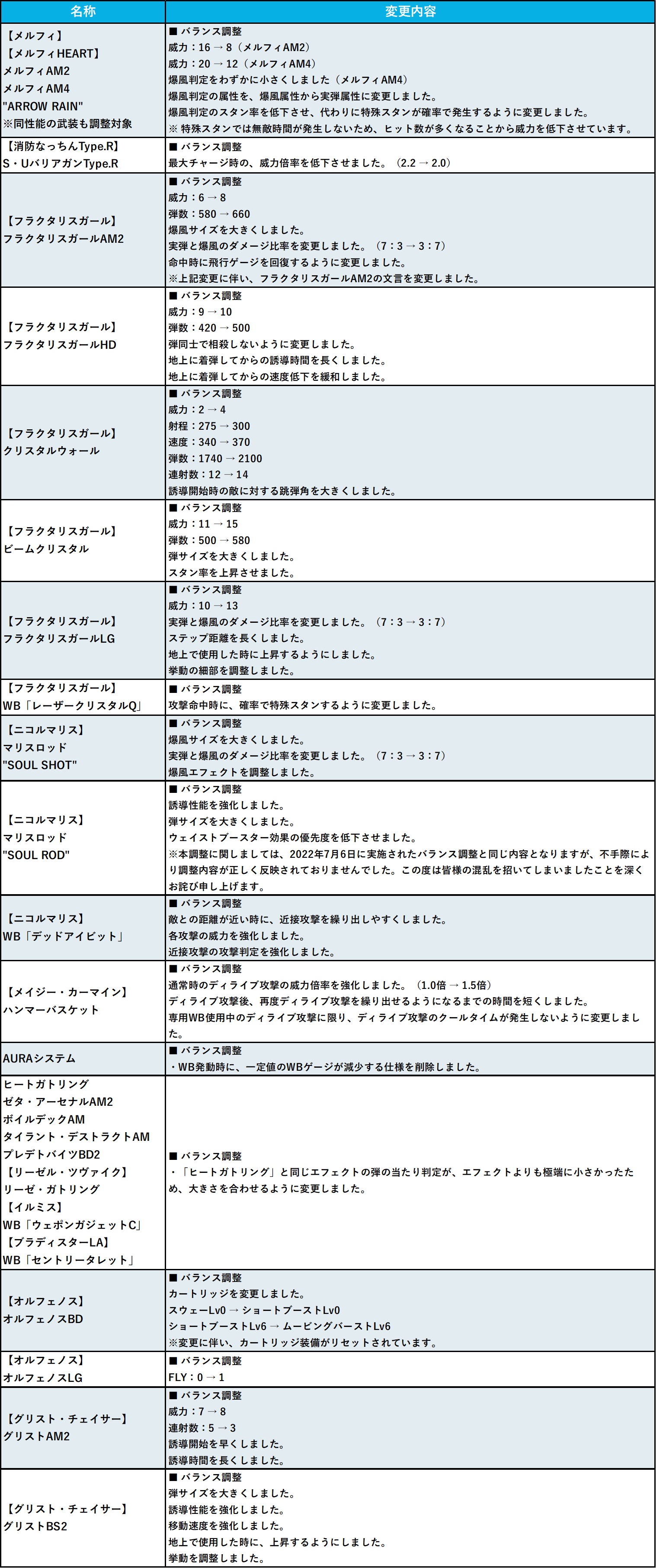 | 【メルフィ】 【メルフィHEART】 メルフィAM2 メルフィAM4 "ARROW RAIN" ※同性能の武装も調整対象 | ■ バランス調整 威力 : 16 → 8 (メルフィAM2) 威力 : 20 → 12 (メルフィAM4) 爆風判定をわずかに小さくしました (メルフィAM4) 爆風判定の属性を、 爆風属性から実弾属性に変更しました。 爆風判定のスタン率を低下させ、代わりに特殊スタンが確率で発生するように変更しました。 ※特殊スタンでは無敵時間が発生しないため、 ヒット数が多くなることから威力を低下させています。 |