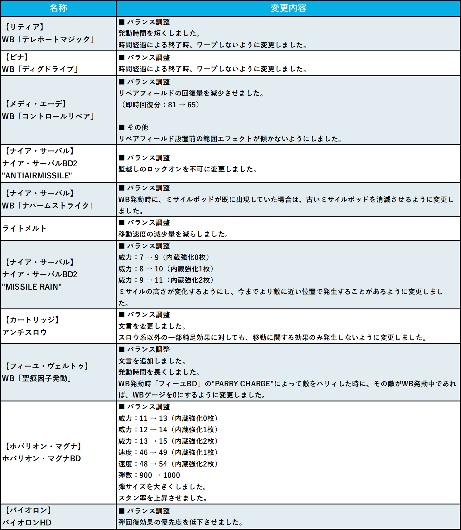 | 【フィーユ・ヴェルトゥ】 WB「聖痕因子発動」 | ■ バランス調整 文言を追加しました。 発動時間を長くしました。 WB発動時「フィーユBD」の"PARRY CHARGE"によって敵をパリィした時に、その敵がWB発動中であれば、WBゲージを0にするように変更しました。 |