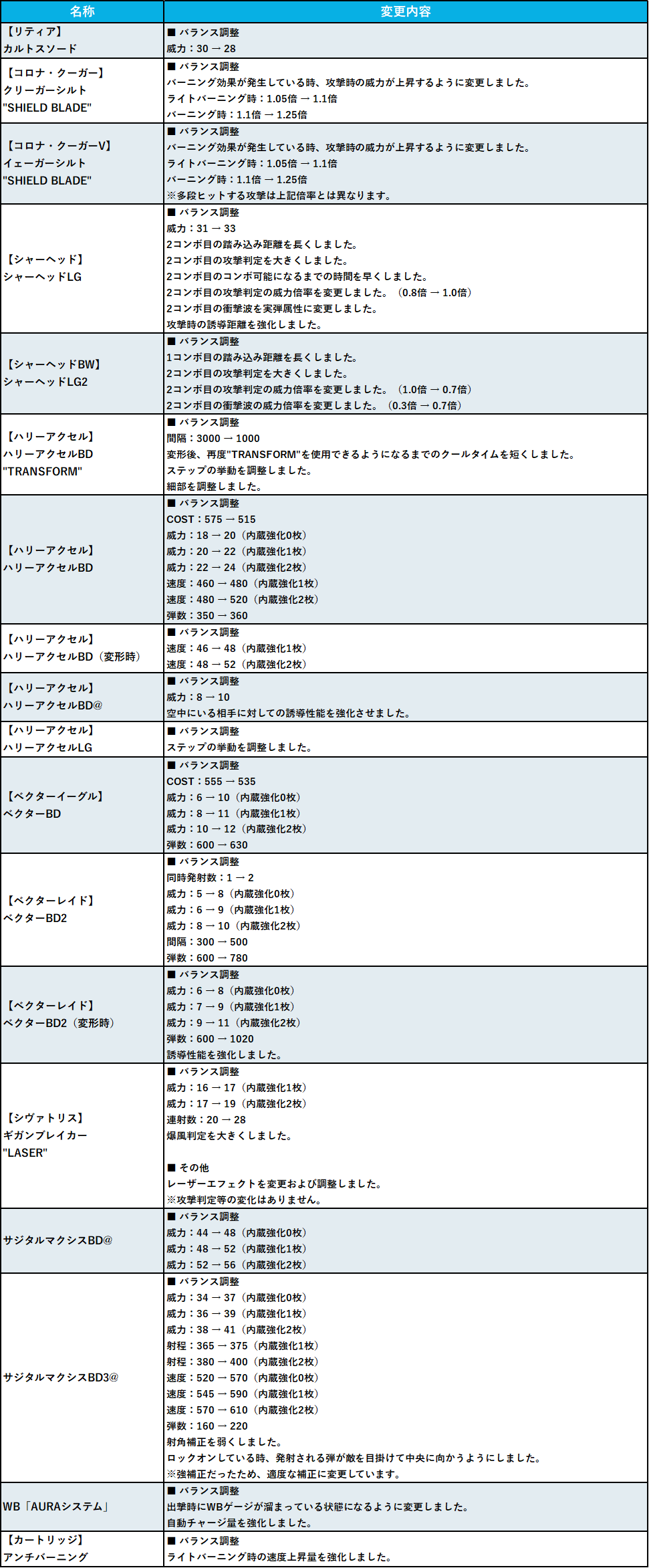 | 【ハリーアクセル】 ハリーアクセルBD | ■ バランス調整 COST : 575 → 515 威力 : 18 → 20 (内蔵強化0枚) 威力 : 20 → 22 (内蔵強化1枚) 威力 : 22 → 24 (内蔵強化2枚) 速度 : 460 → 480 (内蔵強化1枚) 速度 : 480 → 520 (内蔵強化2枚) 弾数 : 350 → 360 |