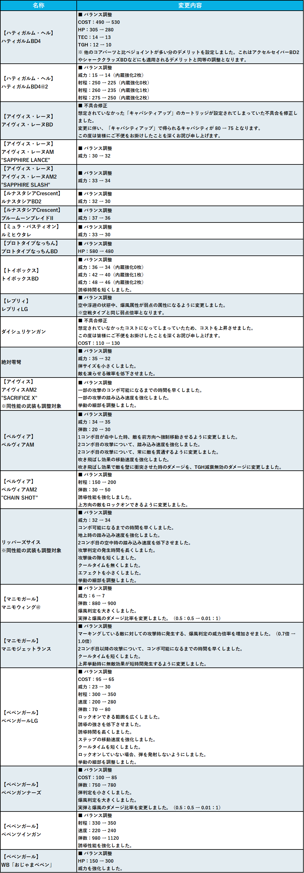 | 【アイヴィス】 アイヴィスAM2 "SACRIFICE X" ※同性能の武装も調整対象 | ■ バランス調整 一部の攻撃のコンポ可能になるまでの時間を早くしました。 一部の攻撃の踏み込み速度を強化しました。 挙動の細部を調整しました。 |