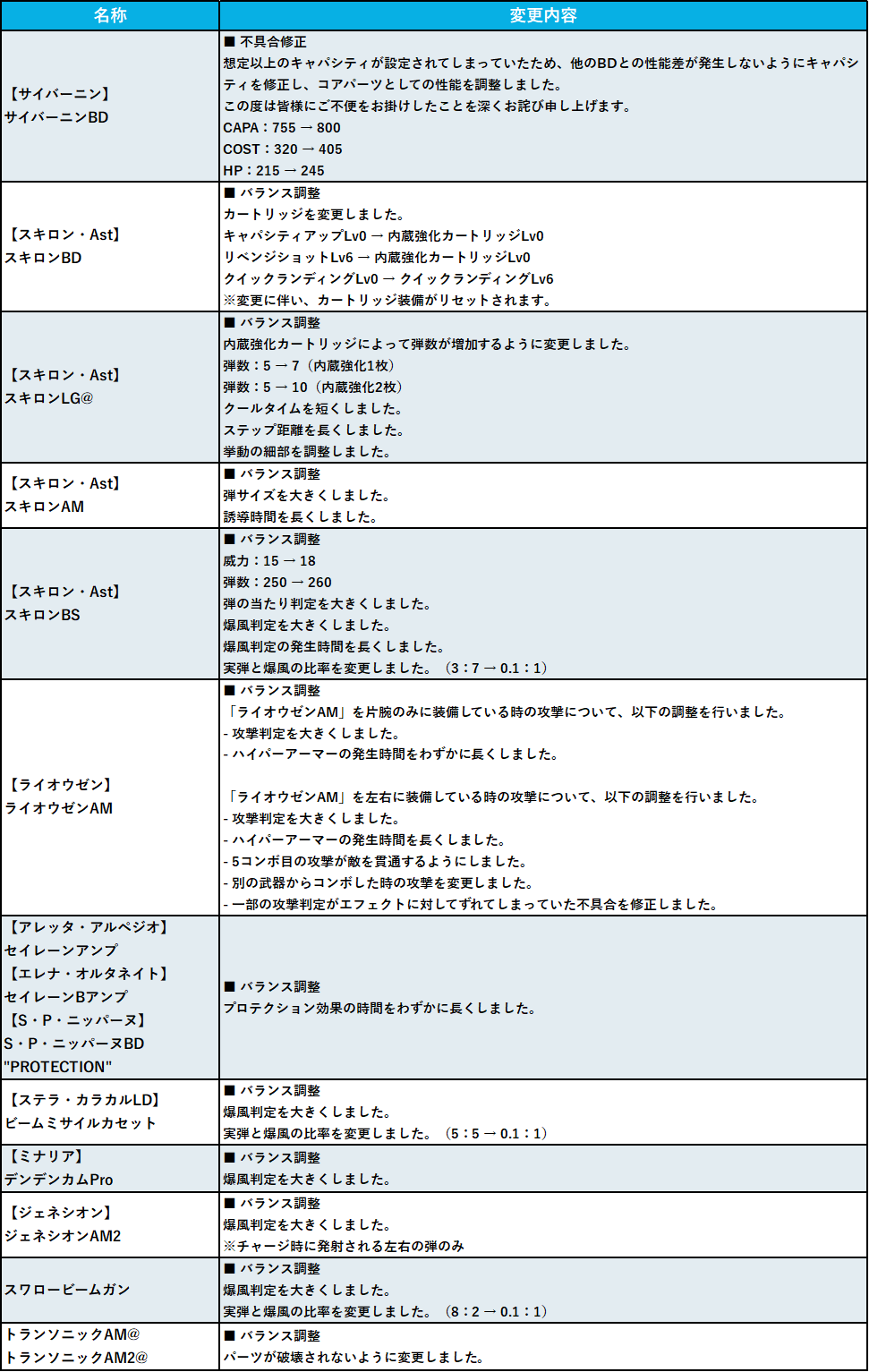 | 【サイバーニン】 サイバーニンBD | ■ 不具合修正 想定以上のキャパシティが設定されてしまっていたため、他のBDとの性能差が発生しないようにキャパシティを修正し、コアパーツとしての性能を調整しました。 この度は皆様にご不便をお掛けしたことを深くお詫び申し上げます。 CAPA : 755 → 800 COST : 320 → 405 HP :215 → 245 |