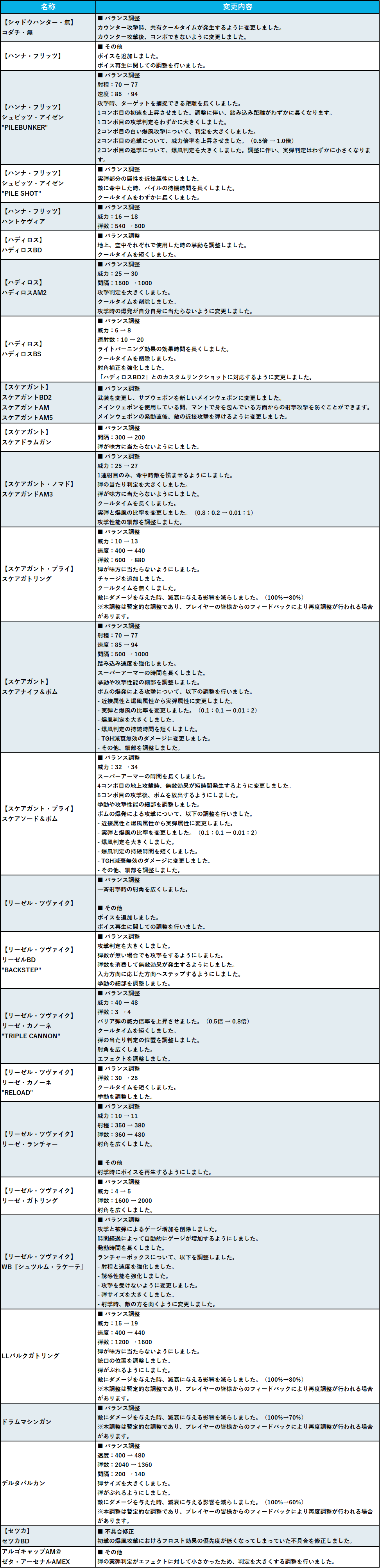 | ドラムマシンガン | ■ バランス調整 敵にダメージを与えた時、 減衰に与える影響を減らしました。 (100%→70%) ※本調整は暫定的な調整であり、プレイヤーの皆様からのフィードバックにより再度調整が行われる場合があります。 |