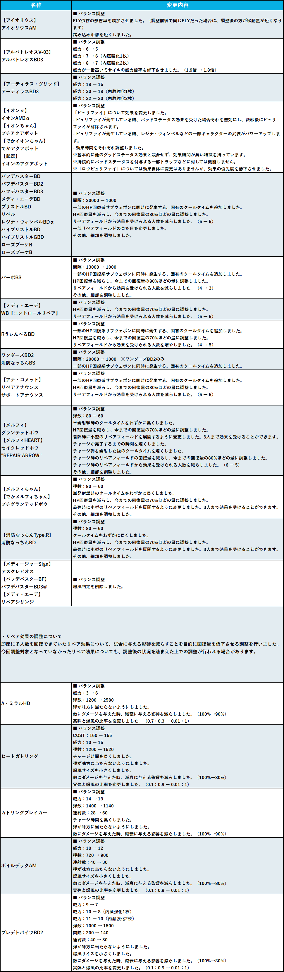 | バフデバスターBD バフデバスターBD2 バフデバスターBD3 メディ・エーデBD プリストルBD リベル レジナ・ウィンベルBDα ハイプリストルBD ハイプリストルGBD ローズブーケR ローズブーケB | ■ バランス調整 間隔 : 20000 → 1000 一部のHP回復系サブウェポンに同時に発生する、 固有のクールタイムを追加しました。 HP回復量を減らし、 今までの回復量の80%ほどの量に調整しました。 リペアフィールドから効果を受けられる人数を減らしました。 (6 → 5) 一部リペアフィールドの見た目を変更しました。 その他、細部を調整しました。 |