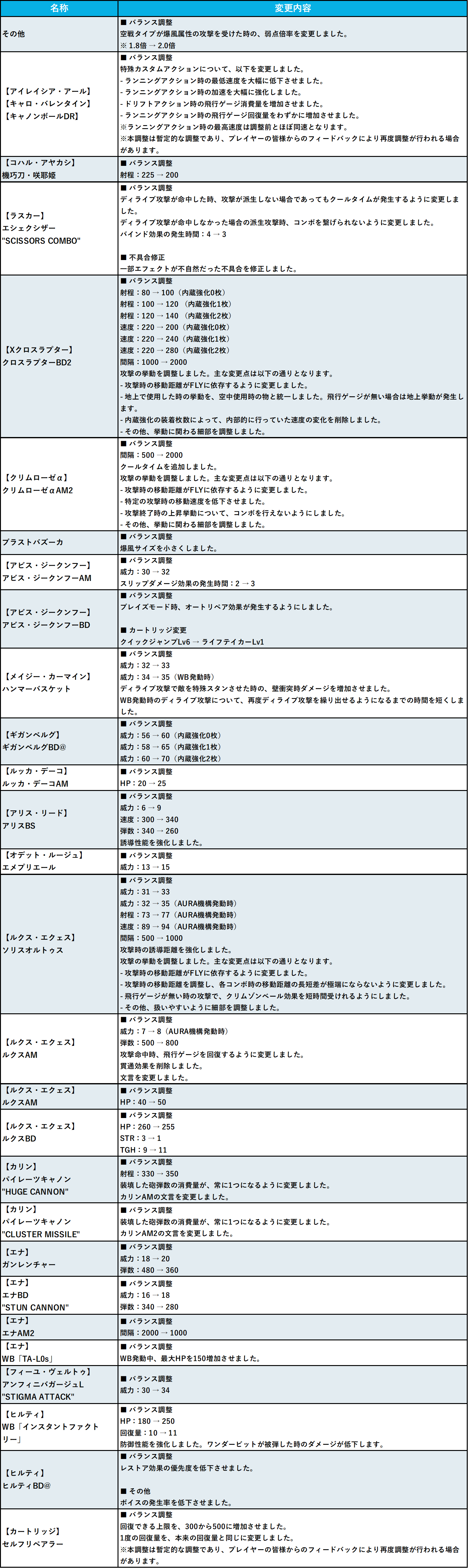 | 【ルクス・エクェス】 ルクスAM | ■ バランス調整 威力 : 7 → 8 (AURA機構発動時) 弾数 : 500 → 800 攻撃命中時、飛行ゲージを回復するように変更しました。 貫通効果を削除しました。 文言を変更しました。 |