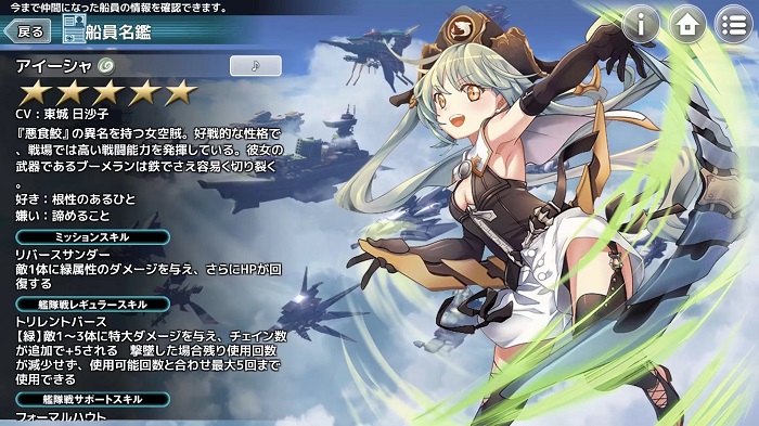 | 説明文 | 『悪食鮫』の異名を持つ女空賊。好戦的な性格で、戦場では高い戦闘能力を発揮している。彼女の武器であるブーメランは鉄でさえ容易く切り裂く。 |
