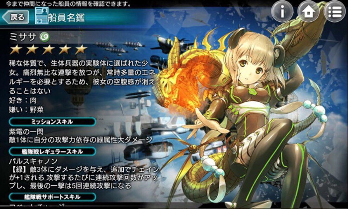 | LV4 | 799 (1999) | ・この船員のATKを1800UP ・この船員のスキル消費TPを10%軽減 |
