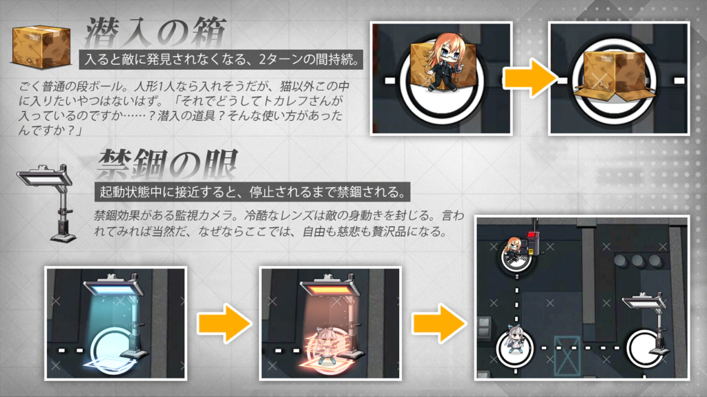 - カリーナのルートは防衛軍が見張っているが『潜入の箱』を使えば警戒させずに行動できる。メタ〇ギアか…?