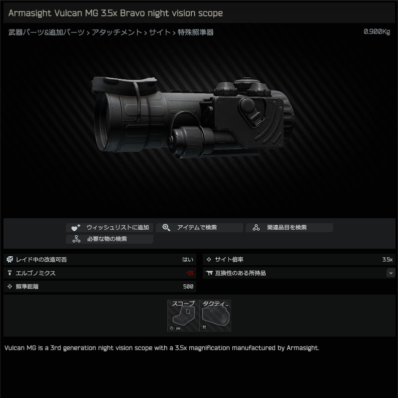 - 3.5倍だけど夜間のスナイピングには不向き。深夜でもちょっと距離あると白飛びしちゃって全然見えないから近距離用と思ったほうが良い。 -- 2022-02-13 (日) 12:14:34