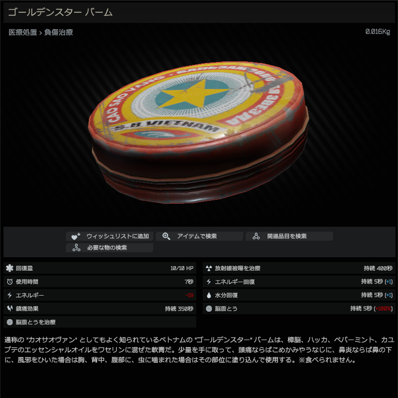 | Golden Star balm ゴールデンスター バーム 「GoldenStar」 | 0.016 | 5 | 7 秒 | ー | ー | ー | 〇 持続 350秒 | ー |