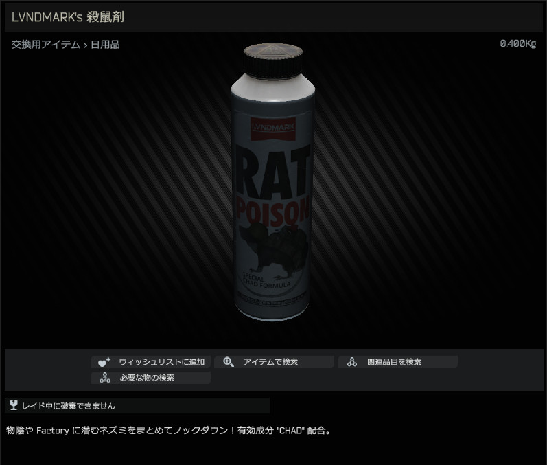 | LVNDMARK's rat poison LVNDMARK's 殺鼠剤 「Poison」 | 0.400 ( - ) | Collector:1個 | _ | _ | _ |