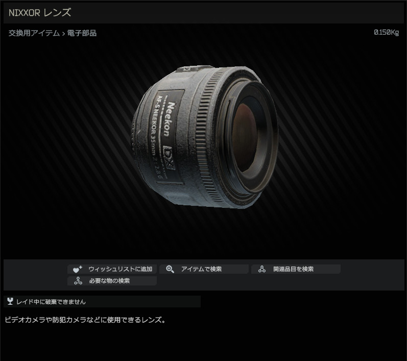 | NIXXOR lens NIXXOR レンズ 「NIXXOR」 | 0.150 ( - ) | Camera,Action!:1個 | 〇 | Lv3.Security:8個 | 〇 |