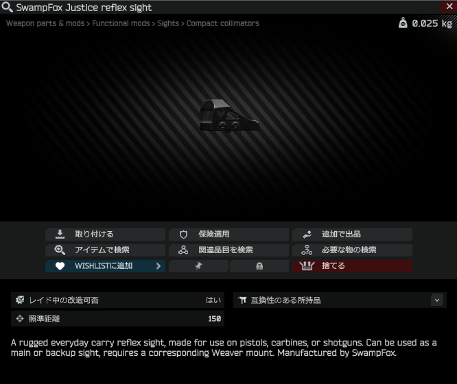 頑丈な日常携帯用反射式照準器。拳銃、カービン銃、散弾銃での使用を想定。メイン照準器または予備照準器として使用可能。対応するウィーバーマウントが必要。製造元:SwampFox。