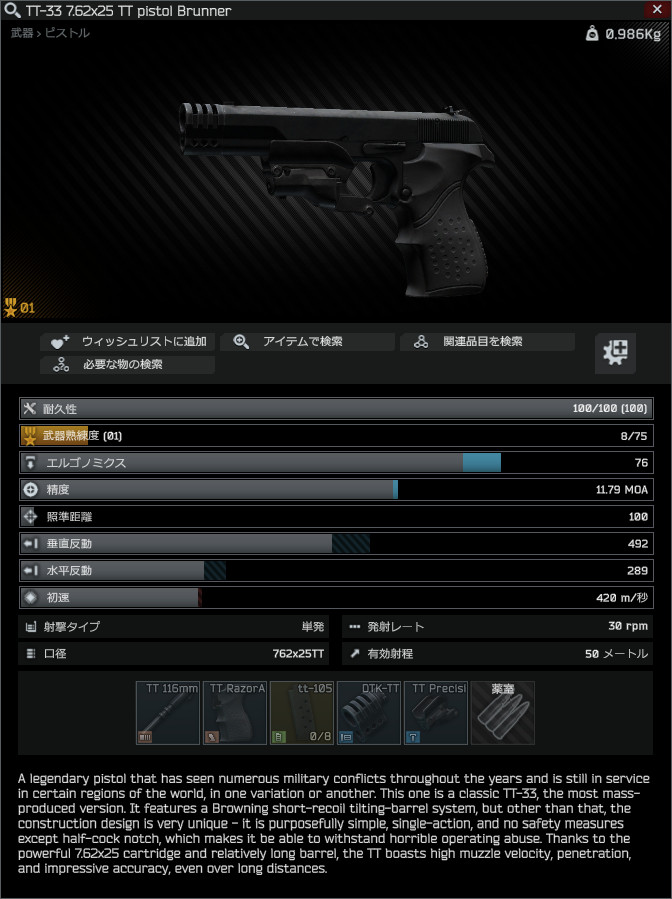 一度の入荷で2個まで購入可能Prapor 1 ₽ 8,194 TT-33 7.62x25 TT pistol x 1 あり 一度の入荷で3個まで購入可能 ※掲載が無い場合は、不使用か入手不可です。
