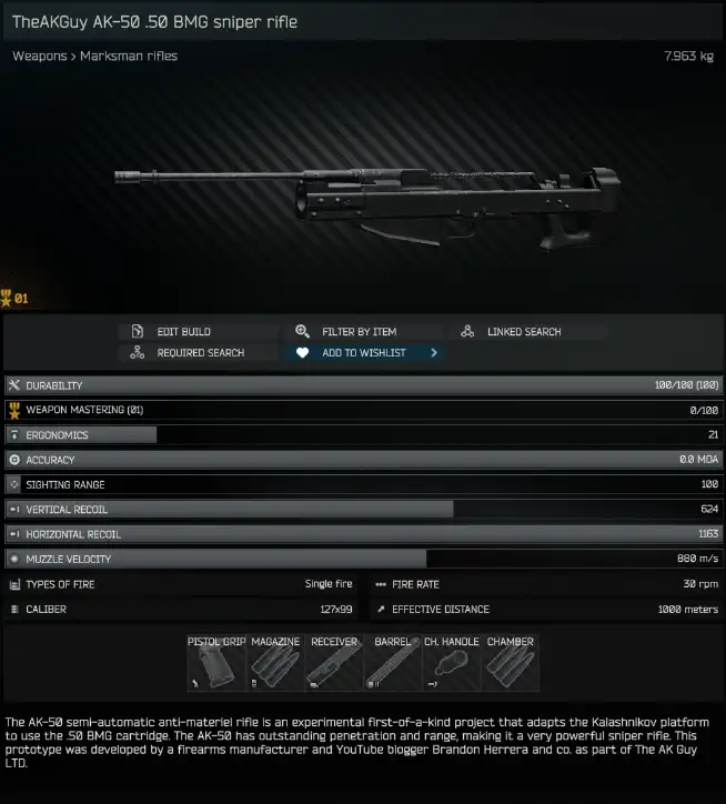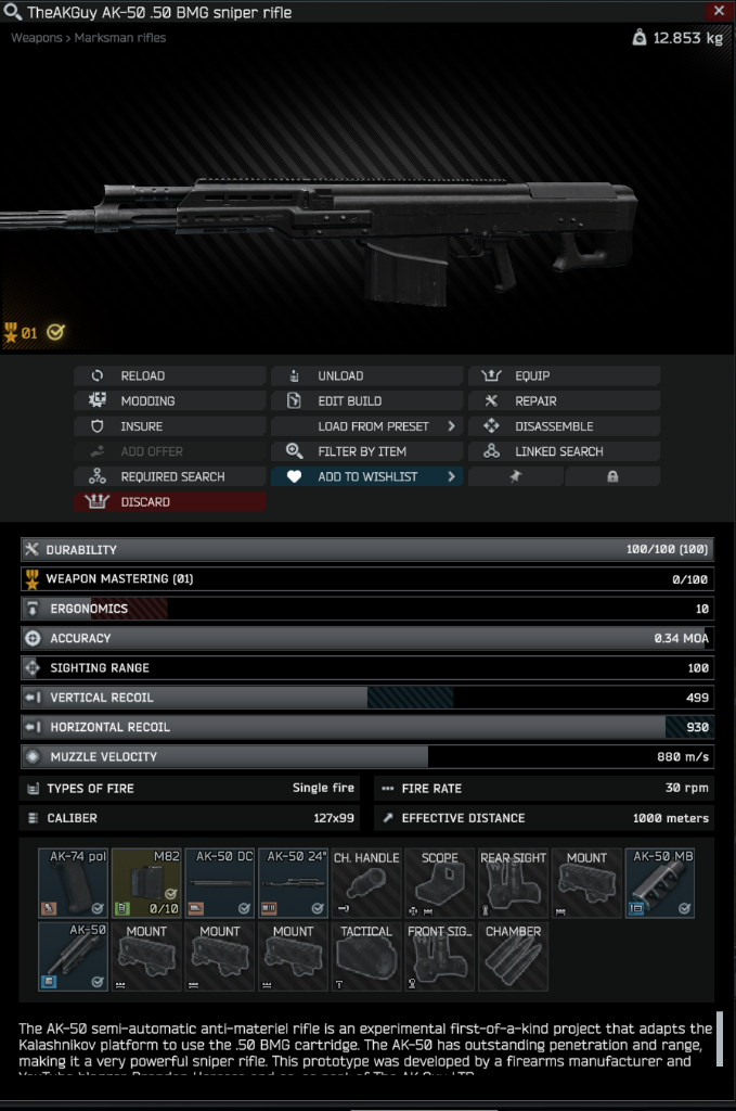 「AK-50半自動対物ライフルは、AKプラットフォームを50BMG弾薬用に改造するという史上初めての実験的なプロジェクトによって生み出された。優れた貫通力と射程距離を持つ、非常に強力な狙撃銃。