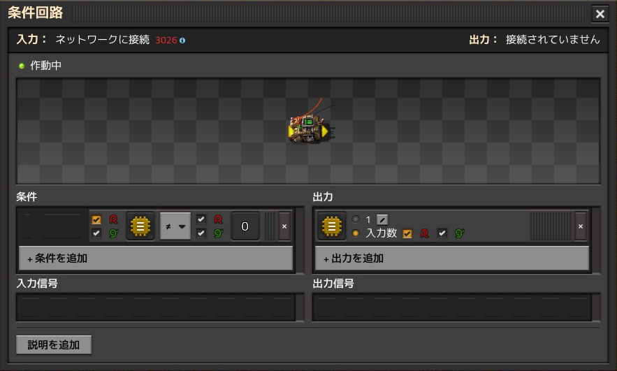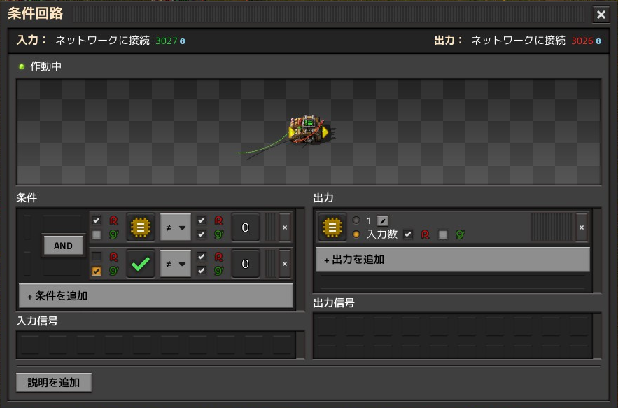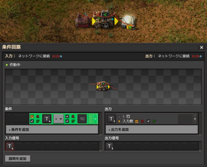 This decider combinator does nothing, but it takes one tick to transmit from input to output. In other words, the ON/OFF change of the input is transmitted directly to the output side, but with a one-tick delay. The setting for the decider combinator in the middle is shown below.