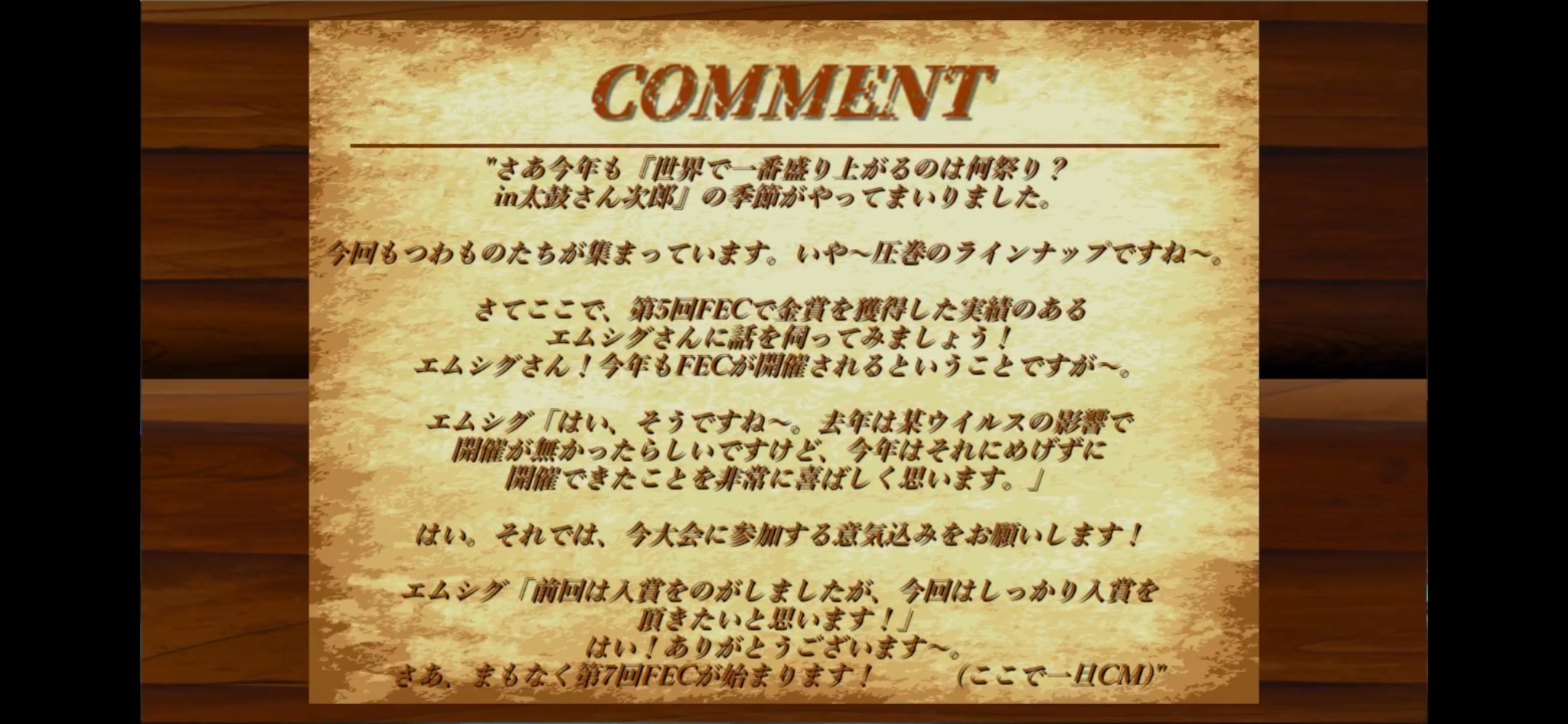 あれから2年。「最終回になるかもしれない」とされていたものの、無事復活が決定。そしてμNG2ndとの同時開催と、大盤振る舞いに(当時の筆者はFEC5th同様過労死になるかとヒヤヒヤしていた)。しかしながら、2年のブランクや、太鼓さん次郎の界隈の縮小により、参加者数はFEC6thから減少。ただし、これでもFEC4thと同じ数値であるし、なんなら譜面数はμNG2ndの譜面を足すとFEC6thを超える(それにもかかわらず主催は少ないと述べているから驚きである)。また、実は氏はTwitterにて「来年、FECかμNGのどちらかを1回だけ開催するモチベが湧いております/多分それを開催して主催は引退になるのかなぁ、といった感じの予測」と述べており、今回の大会でまた最終回になる可能性が懸念されていたが……。