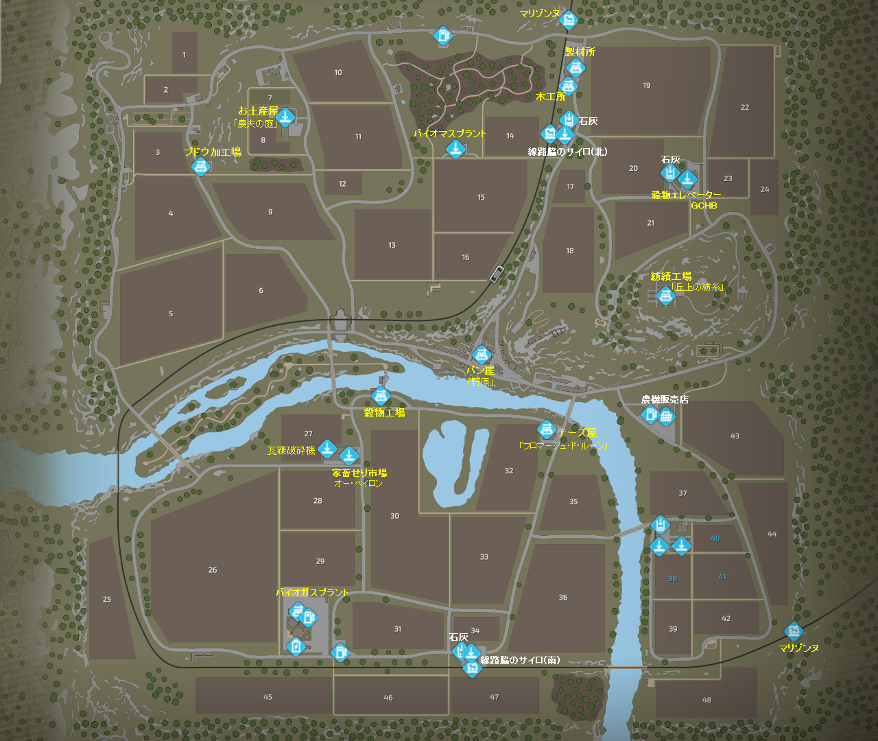 - マップ下半分はほぼ平地だが、上半分は非常に高低差がある。そのため、穀物エレベーターや紡績工場に納品する場合は、高馬力のトラクターでないと登坂に時間がかかる場合がある。