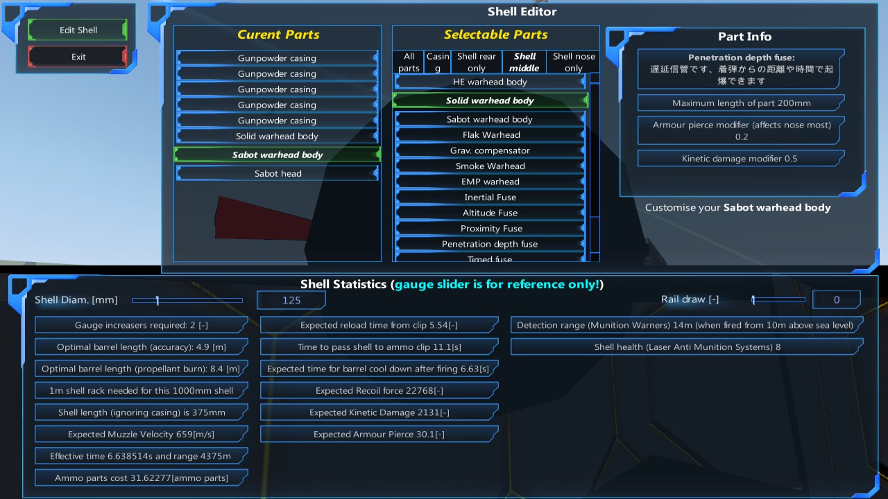| Maximum length of part | 砲弾の最大長。直径500mmの砲弾でこの数値が100mmのパーツが有れば400mmの余裕が出る。(追加で信管2個付ける余裕が出る) |