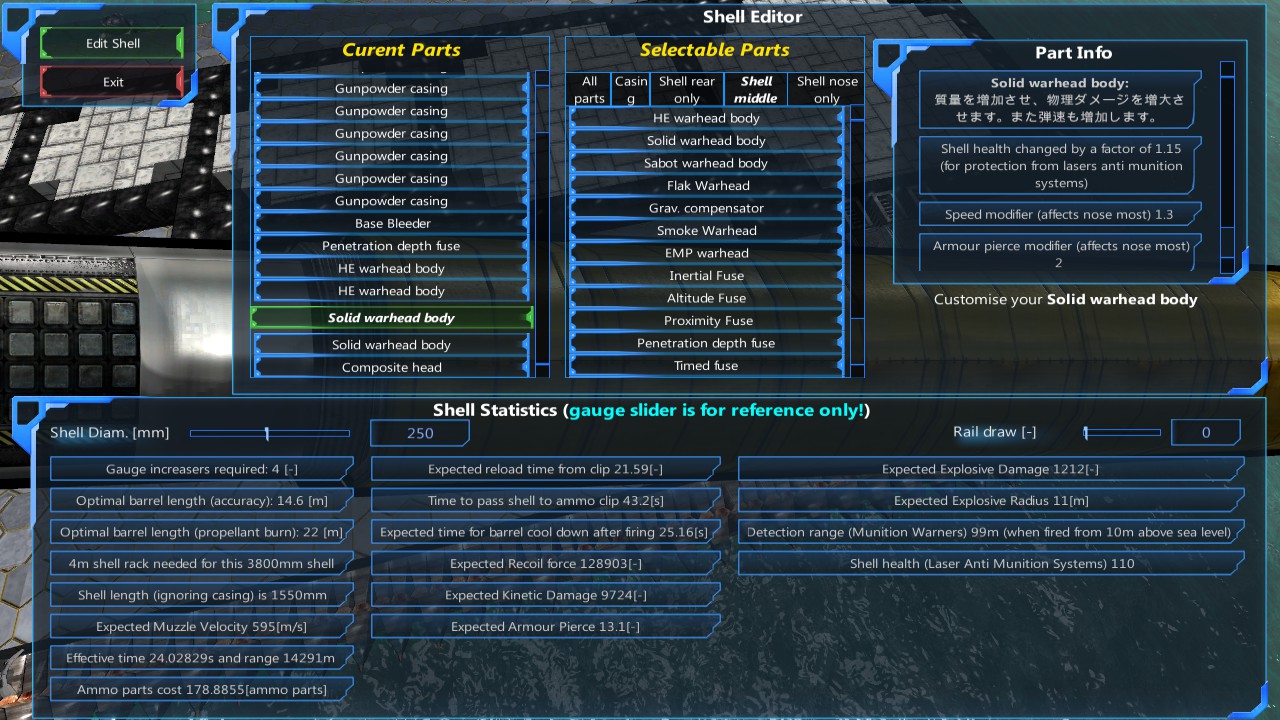 | Shell Length (ignoring casing) | Gunpowder casing、Railgun casingを除いた砲弾の長さ |