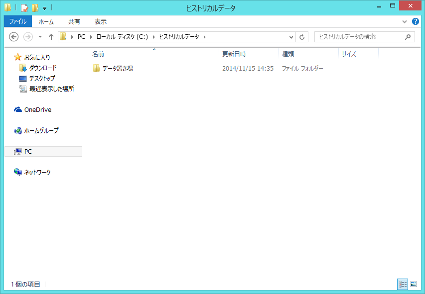 - Cドライブに[ヒストリカルデータ]というフォルダーを新規作成して、[ヒストリカルデータ]フォルダーに[データ置き場]というフォルダーを新規作成する。
