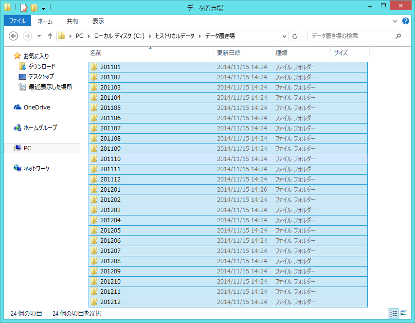 - [データ置き場]フォルダーに201101フォルダーから201212フォルダーまでの2年分を移す。