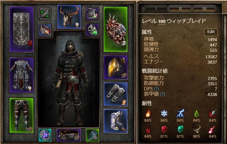 事前にウィッチブレイドで「闇き者の賜物」セットを揃えておいたので、短時間で作った割には最終装備レベル並に整っています。