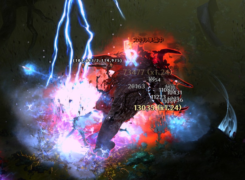 いつもの画面が真っ白になるエレメンタル系ビルド。今回は盾で100%ブロックしたいと思いながら稲妻を発する。