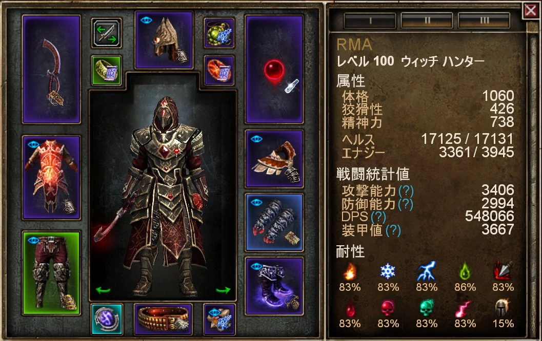 ビルドを再現する場合はエルドリッチの囁きの導管に付与される耐性がランダムなため、その辺りの調整が必要になります。またMIレア2カ所の接辞で気絶耐性とOAを稼いでいる点も注意が必要です。ビルド例では接辞でカオス補正も付いてますが、これは無くても問題ないです。腕と足は耐性パズルによっては神話級 ヴォイドスチール ガントレットと神話級 タイムワープト ウォーカーズも利用できます(ただし、後者に関しては精神力のフォローが必要)。