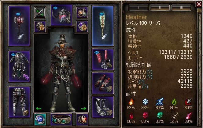 | メインハンド | 神話級 デス オーメン | ホーンテッド スチール | ラヴァジャーの目 | この子を使ってあげたかった スキルボーナスがすごく強いできる子 | エクセキューション+2 ハービンジャー オブ ソウルズ+2 |